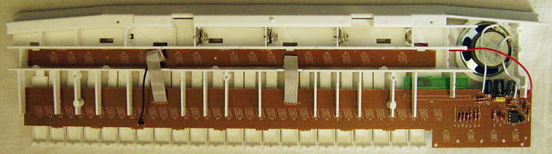 The main voice is based on low resolution samples, those sound grainy in the bass range by low sample frequency. Within the limits of their low resolution, the preset sounds are fairly realistic. The "piano" sounds like what the name suggests. The "trumpet", "flute", "violin" and "clarinet" contain a delayed 6Hz vibrato. The "xilophone" sounds a little metallic with hollow bass range; it may be rather a glockenspiel. The "guitar" may be a nylon string acoustic one. The "organ" is an electronic one, which makes a plain toot with percussive attack; the waveform is semi-brassy with grainy bass range and reminds to bagpipes. It can be described best as a beat organ. The digital volume control steals bit resolution of all sounds, which truncates the decay phase at low volume and thus can be rather regarded as a sound effect.