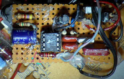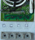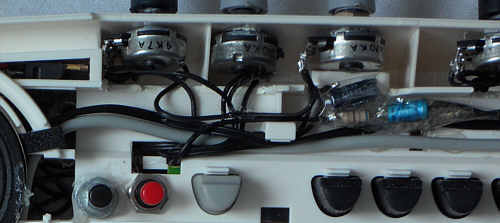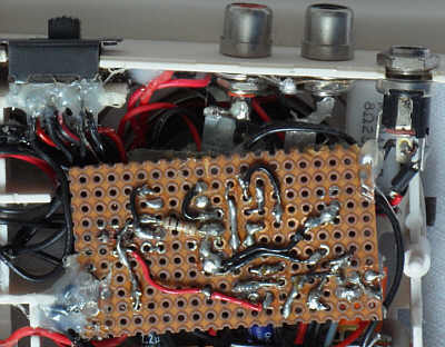 After pressing the "internal rhythm" button, the IC will now produce 4 different drumrolls by pressing the drumpads. When the instrument tries to play its own rhythms in this mode, the result are quite wild tribal rhythms because the IC outputs instead of individual drums now a drumroll sequence for every single pulse. When the rhythm pitch pot is turned way down, the IC will skip some of the CPU pulses and thus makes freaky jungle grooves. Attention: I have only very incomplete