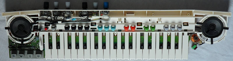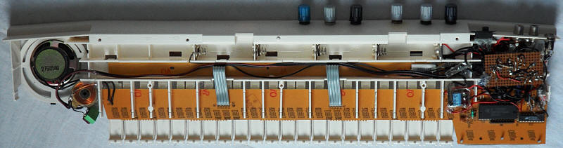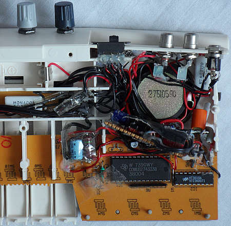 circuit bending detailsThe Bontempi B50 is built around on the CPU "Texas Instruments W 739GWY, COMUS 2743338" (clocked by LC oscillator) and rhythm IC "HT3010A". The main voice is output through something like a primitive bitstream DAC through a digital single transistor amp to the speaker. So it contains obnoxious beeping PWM residues those must be filtered out to turn this into a useful instrument.B-series hardwareIn monophonic Bontempi B-series keyboards the separate percussion IC exists only in models with accompaniment. So I conclude that the employed microcontroller hardware ("Mitsubishi 3850" in B20, apparently "Texas Instruments TMS370Cx1x" in others) has not enough resources to produce both percussion and chord channels at the same time in software. The fact that B20 has a documented generic microcontroller and pinout of the rest matches TMS370Cx1x makes me conclude that the entire B-series sound engine is a softsynth on a chip.caution: The case of the classic B-series is an unusual construction of iPhone-esque confusion potential. To open it, a piece of paper should be inserted under the black keys (hold white keys down for this); else you risk to crack them off. Then remove bottom screws. Push all buttons under their rear rim while you move the white keys back to slide the chassis out. (There are no screws under the front panel sticker, thus do not attempt to peel it off!) If during reassembly the chassis refuses to slide fully back in, check out that the PCB is properly aligned with all rubber contact strips in place and all plastic pegs in their holes. (Also the last peg must be on top and not bent to the side of it.)