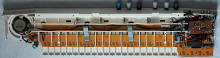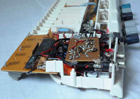 But after modification it makes a great tekkno instrument because it has many freaky howling synth sounds with gritty stepping zipper noise envelopes. Even the sampled drum machine chip can make nice lo-fi tribal patterns when pitched down and run out of sync to the main CPU. This was one of my first complicated circuit-bends and I try hard to reconstruct what I had done. When unmodified, this keyboard is not good for anything (unless you can remove the beep by external filters or sampling it through effect software).