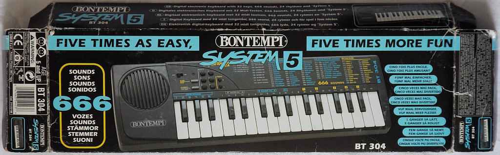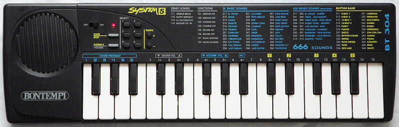 This was a cheaper version of Bontempi GT 509 without drumpad buttons. Because they also act as chord buttons, in BT 304 the 6 leftmost keys are used as single finger chord section, which shortens the melody section.