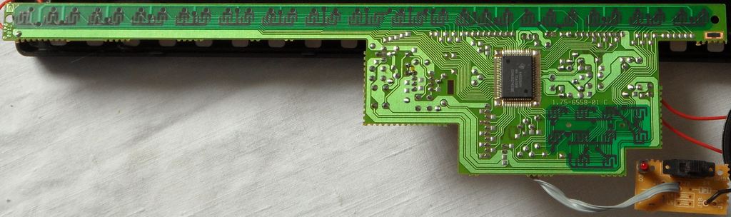 Like Casio SA-series, the sound engine is likely a single-chip softsynth. Beside internal ROM content, the CPU may be identical with the A45016PH used in Bontempi BS 2010 variants. It has 2(?) unused pins those apparently output internal state info. On my tube oscilloscope I can see something like a bit chain that varies depending on which keys are pressed (and possibly other internal register stuff). This might be an I²C bus. |