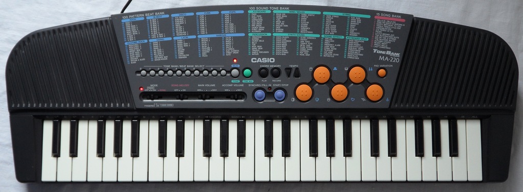 The rhythm and accompaniment is also very similar like MA-130 (grainy lo-fi samples) with the only difference that here there is also a manual chord mode (pipe organ timbre) with rhythm off. Unfortunately it plays nothing else than standard establishment chords and stubbornly ignores any other key presses even in fingered chord mode. When new keys are pressed in the chord section, it always stops the organ chord tone for a fraction of a second, even when the new key combination continues with the same chord. (This can be also used as a sound effect.)