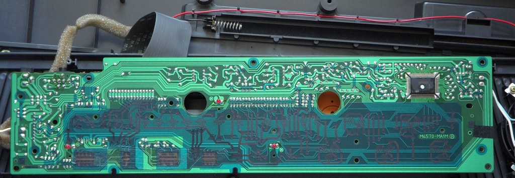 hardware detailsDespite same sound and rhythm set like Casio MA-130, the CT-840 has instead of the classic SA-series CPU M6387 an "OKI M6567-04" with 80 pins.A bit strange is that there is an unused section with empty holes on the amp PCB; possibly originally a different microphone amplifier was planned here and then left blank to circumvent a PCB design flaw; the given mic amp seems to be mounted on a small daughterboard instead. The key leds are demultiplexed by 2 octal latch logic ICs 74HC373AP.