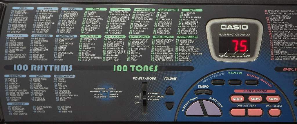 Unusual is that many songs and panel writing is in German, so Casio made local variants of this. It even has also a few synth effect noises in the style of SA-series and some techno styles. Annoying is that the volume of this big plastic monster can not be set lower than medium.