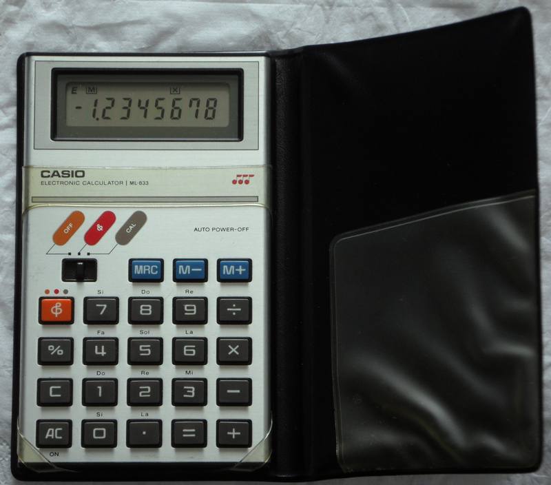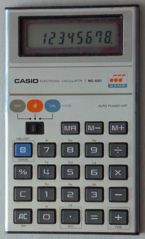 In music mode the cipher buttons and dot act as piano keys. Other buttons play a blip. The calculator is pretty basic; it can not playback results as a note sequence. Strange is that the "AC" button even erases the calculator M+ memory; it also is cleared by power-off or starting the game. The non-game twin ML-833 does not clear it (only manually by pressing 'MR' twice), which makes me conclude that this was done because the game occupies the same register as ram and hence erases calculator memory.