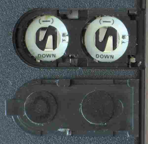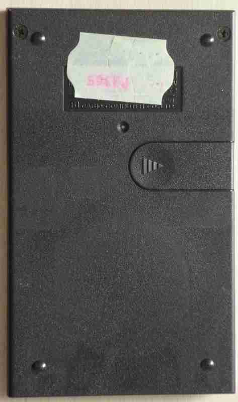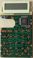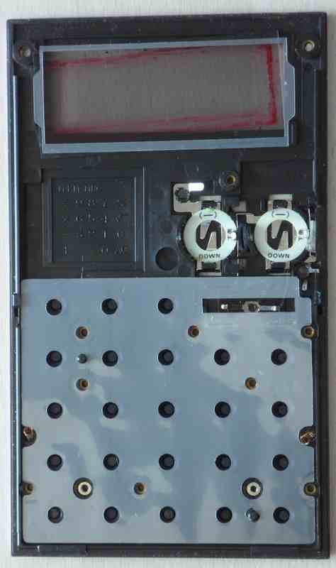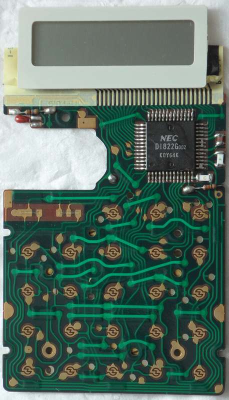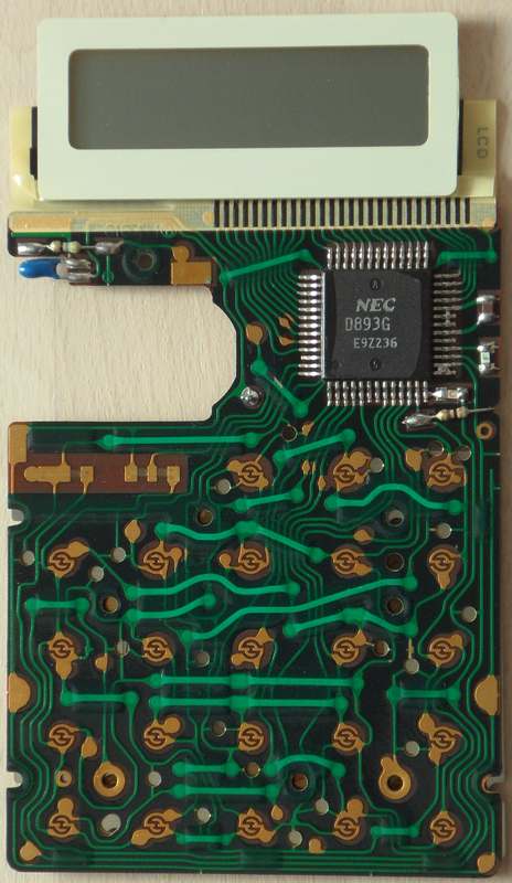 note: To open the case correctly, first remove battery lid and both bottom screws. Then slide the bottom vertically down and lift it off. (Do not pry.) The PCB is held by additional screws under the speaker. Regard that there are 2 different screw lengths (long ones go through metal). There are 2 tiny springs (touching +Vs for shielding) and 2 tiny nuts underneath. (Don't loose these.) The piezo speaker dangles on a thin wire and needs at least one of the 2 nuts with screw installed as pole to make it sound. Fortunately the LCD has no metal bracket an can be easily lifted out together with the PCB. Do not damage the LCD foil cable. The specimen from eBay was pested with orange permanent text marker paint, that made buttons stuck, so I had to take all buttons out; washing plastic parts in water with detergent was not enough, so I had to scrape the button holes with screwdriver to make them fit again. Despite I thoroughly cleaned the separate LCD polarizer foil with isopropanol and cotton swab, it still has orange paint residues at its rims. caution: The LCD foil cable is fragile. Never pull at it (it may snap off) nor sharply fold it (carbon traces crumble off). Handle it with extreme care. (If the cable comes loose at an end, install an adhesive foam rubber strip to press it on.) Inside the case is an embossed button layout plan of Casio ML-831 (has squareroot, no game) which hence apparently was designed first and contains the same PCB with CPU "NEC D893G". The green PCB is dual layer with coated silver(?) paint bridges crossing traces at the same side. The back has only a grid pattern (shielding?). Very unusual is that the black rubber keymat is completely conductive (some kOhm across its ends) and not only the spots under keys, so it needs a thin plastic foil spacer with holes for each key to insulate the rest. The clock rate (roughly 65 kHz?) is set by a resistor (not DC-controlled, lower = faster). keyboard matrixThe keyboard matrix of this monophonic instrument has no diodes. Interesting is that this one is active-low, which hints that its CPU is even less related to VL-1 than other musical calculators. The only 4 input lines hint to a simple 4-bit architecture. The only eastereggs are a 2nd 'AC' (which does not stop the melody nor can powers the calculator on) and power off button.