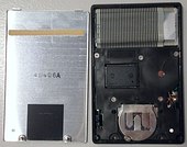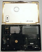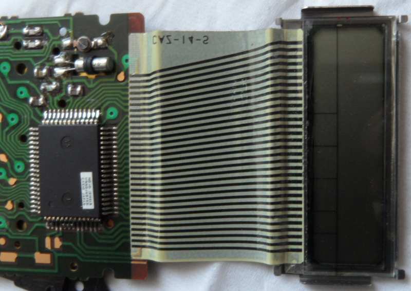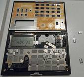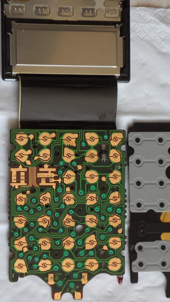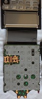 Do not remove the PCB or LCD if avoidable; the foil cable is fragile and in this model has no reinforcing adhesive film on the opposing side of the connector. The big black plastic plate (stabilizer) can be unscrewed and lifted off (be careful with the speaker wire). The stabilizer must be screwed properly on top of the PCB to prevent the case from flexing; else buttons get stuck or fall in when pushed to hard. Thus for tests only press them very lightly if the stabilizer is not in place. The PCB is held with 2 additional tiny black screws. After lifting it up, also the LCD metal frame can be carefully lifted out (not at the cable!), starting at its lower rim. caution: The LCD foil cable is fragile. Never pull at it (it may snap off) nor sharply fold it (carbon traces crumble off). Handle it with extreme care. (If the cable comes loose at an end, install an adhesive foam rubber strip to press it on.) The upper tabs of the LCD metal frame must be inserted under the plastic rim, then the bottom end carefully pushed down.