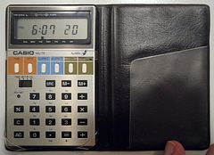 Annoying is that (unlike ML-80 or ML-81) the internal calendar supports only dates between 1910 and 1999 (entered as 2 digit numbers), which since 2000 makes the day-of-week dot indicator and related melody alarms go wrong. It also has no date calculation, despite some residues of it still can be seen by entering incorrect dates; so e.g. 18-13-32 is automatically corrected into 19-02-01 by advancing higher digits, and dates still can be entered in calculator (no only 'set') mode despite nothing else can be done with them (neither calculation nor storing a date into memory works). Possibly this was done to to reduce rom consumption of the software to make the 12 melodies fit.