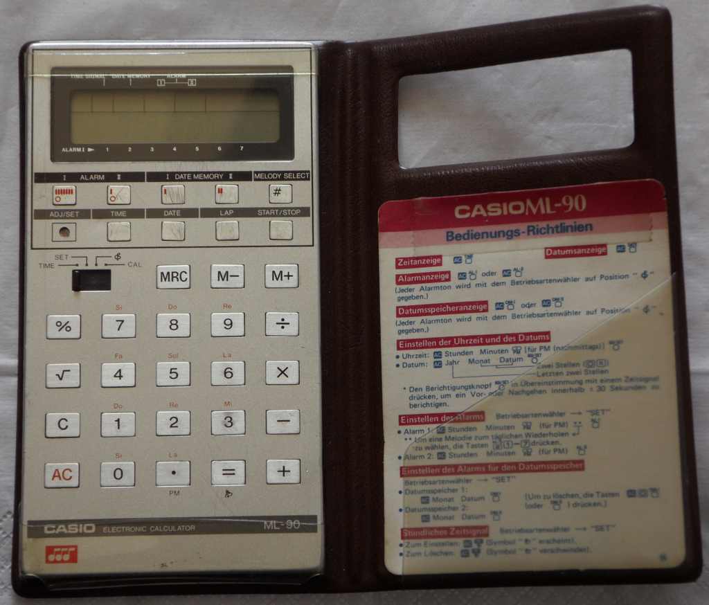Once upon a time, calculators at school were considered as cool as nowadays smartphones. Although still mostly banned in math lessons as a cheating tool, kids boasted with having the newest calculator with the most interesting non-mathematical features. So as a highend gadget, the German retail price of this one was (if I remember well) quite enormous 119DM (equals roughly the same in modern Euros). But with 12 melodies, musical calculation result rendition and alarm clock calendar complications it was a technical marvel of its time, that despite high initial price sold quite well, so nowadays it is fortunately not rare.