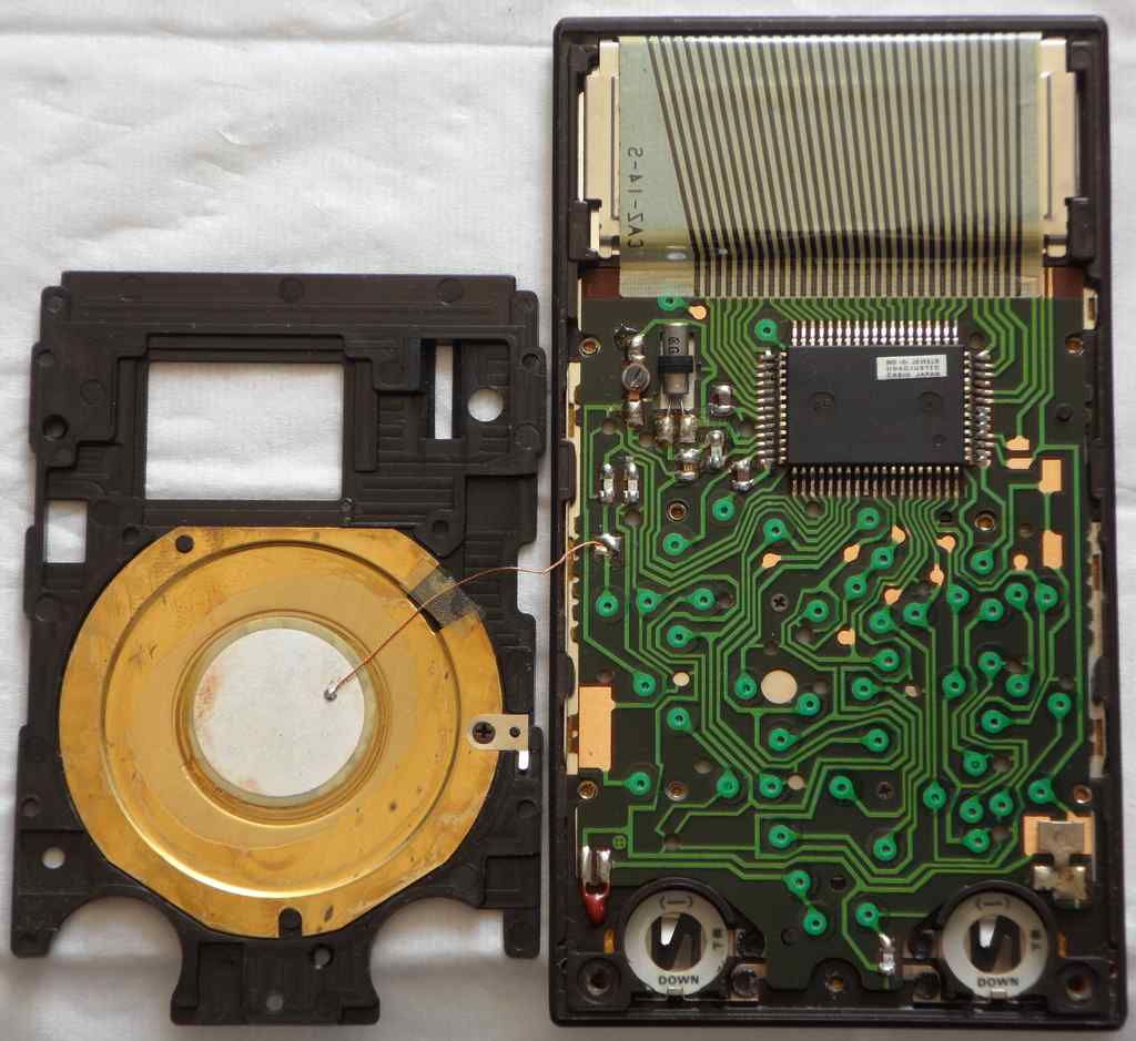 hardware detailsThe Casio ML-90 is based on an unidentified version of the D1864G CPU (crystal clocked likely at 32.768 kHz), which directly drives the piezo speaker. This CPU is soldered upside-down, so the print side can not be seen, but by pinout and behaviour it is almost for certain a software variant of the same CPU like in Casio ML-81.