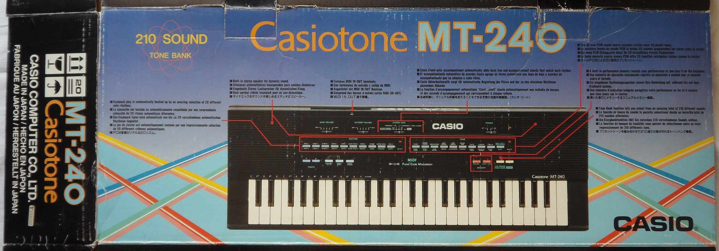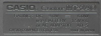 The same CPU and ROM like MT-240 was used in the lower keyboard of Casio DM-100 (the likely world-only dual-midsize-keyboard instrument, seen in service manual). Other MT-240 variants with 10 preset sound buttons (210 tone bank) were released as Casio MT-260 (aka Hohner PSK15 in white, large "Tone Bank" list), Casio MT-140 (aka Realistic Concertmate 750, mono). Also the lower keyboard of the Casio DM-100 had this sound hardware (no MIDI, upper keyboard resembles Casio SK-8 main voice). Fullsize variants were apparently the CT-370/ CT-380 (49 keys, mono, no MIDI), CT-607/ CT-615 (61 keys, mono, no MIDI) and with 15 preset sound buttons the CT-640 (61 keys, 465 tone bank, aka Hohner PSK50 in white). These have no preset sound "sound effect" 1..2 and the rightmost 4 semi- OBS sound buttons are {flute, chorus, bells, percussion | synth-reed, metallic sound, synth ens, bass} (seen on Casio CT-370). Another 210 tone bank variant may be CT-420 (49 keys, demo "Ballade Pour Adeline", aka Hohner PSK35 in white with black "Tone Bank" list) and its mono version CT-390 (aka Hohner PSK25 in white). Likely an MT-240 with 61 midsize keys, 15 preset sound buttons (465 tone bank list) and different ROM was released as Casio MT-740 and fullsize as CT-650 (aka Hohner PSK55, white, different ROM seen in schematics). Likely a variant of this was CT-636/ CT-638 (rounded case, only 3 switches).