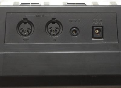 All main voice sounds employ a mild stereo chorus effect and a dose of reverb those can not be turned off. There are also neither sustain nor vibrato controls on this instrument and many preset sounds contain annoyingly long sustain. The sounds are genuine stereo (with different panning positions, not just a rotary speaker simulator) and apparently the sound generator employs oversampling because low notes turn duller (like with FM keyboards) and not rough and grainy like with most cheap sample based lo-fi tablehooters. Thus the preset timbres have high tone quality and sound fairly noble although not all of them are realistic. The sampled "piano" sounds astonishingly real and has about 7 split zones (much more than I found on other average home keyboards); you can even well here the woody knocking hammers with higher notes. (Only velocity is missing.) The "harpsichord" rather reminds to a funky clavinet or slap bass in the bass range and like many other timbres here it sounds a bit reedy and of plastic in the mid range, but it still sounds nice. The "funky clavi" is duller and especially has a dull bass range and reminds more to a fuzz distorted lead guitar (also with plastic mids). The "elec piano" has sustain and a slightly squawky timbre (semi- metallic, Rhodes imitation?, also a bit guitar- like with brassy mids); in the bass range a split zone makes it very dull (like a down sampled xylophone?). The "vibraphone" sounds nicely realistic (with 6Hz vibrato); the bass range is quite dull and woody. The "jazz guitar" is more a dull electronic organ timbre with mild tremolo (chorus effect?) decay envelope and dull bass range. The "jazz organ" is a slightly hollow Hammond imitation with percussive attack and mild chorus, while "organ" reminds to a clarinet or wooden pipe organ rank or the "synth reed" found on SA-series keyboards; it has chorus, a dull bass range and slightly longer reverb. The "pipe organ" is a bright metal pipe organ rank timbre, that reminds to the famous multipulse squarewave timbre, but is brighter, has chorus and a duller bass range, which makes it sound more like a transistor organ with a small dose of leslie and sustain; unusual is that volume decreases during the first 0.5s. The "accordion" sounds a bit of plastic in the mids, but otherwise quite natural (with semi- woody bass range). The "brass ens" sounds not at all what the name suggests, but is a thin sounding reedy plastic timbre with strange scratchy attack phase, chorus and a 4Hz vibrato that continues during its fairly long reverb. Possibly it is made from sawtooth waves; it has much similarity with certain thin C64 timbres; especially the (duller) bass range reminds to C64 organ bass sounds. (This sound has nothing to do with the famous SA-series "brass ens" but resembles rather "pop lead" on SA-series or the "magical wind" sound on Casio CZ-230S.) The "strings" fades louder and then quieter during the first second before it holds with fluttering tremolo. The timbre is a little bright and thin and even slightly resembles the bizarre "cello" on Casio CZ-230S although it lacks the drastic timbre change; the trebles have something of a mosquito, and there is a 2s long sustain (which often disturbs). The "flute" has a delayed 4Hz vibrato and while high notes resemble a metal flute, low notes are more like dull woodwinds. The "chorus" attempts to simulate a human choir, but the timbre is more like a dull synth brass chorus with slow attack and fluttering tremolo; the bass range is very dull. The "bells" is a grainy lo-fi timbre of long clanging church bells with a very long echo of repeating clangs (over 10s!); lower notes sound dull and disharmonic. The "synth ens" is a slightly sitar- like bright timbre with decay envelope, 6Hz tremolo and long sustain; the bass range sounds grainy and woody (reminding to some Miracle Piano timbres). The "bass" is a key split sound with a dull e-bass (or nylon guitar?) to the left hand and a funky hammering fat slap bass to the right hand. Great is that when a key is trilled, each new note occupies a new sound channel, which produces a great phasing sound and volume increase effect although this eats up polyphony. Like with many other MIDI keyboards, pressing semi- OBS preset sound buttons with held notes does not affect them in any way but only changes the sound of newly played notes (this can be also used for play tricks, especially with "sound effect" sounds).