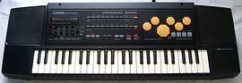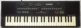 All sounds are made from medium resolution samples; many sound quite natural, others have organ- like timbres but none are really grainy; apparently some oversampling hardware prevents this. The timbre quality is higher and sounds a bit warmer than cheap Casio 100 ToneBank keyboards (like SA-series or MA-130) although their squawky appeal is partly similar and like with these there are many unique and well recognizable sounds (but those 100 ToneBanks sound more extreme). The acoustic "piano" sounds very real and the natural drum kit percussion sounds way clearer and features astonishingly realistic cymbals. There are 2 keyboard effect kit modes for separately playing all the sounds from the "sound effect" patterns (one per key), those include also some wicked tekkno siren noises and space laser sounds those later found their way into SA-series.