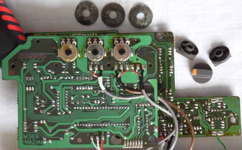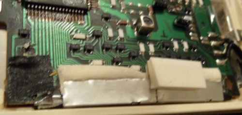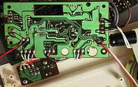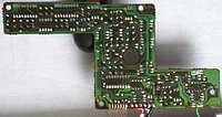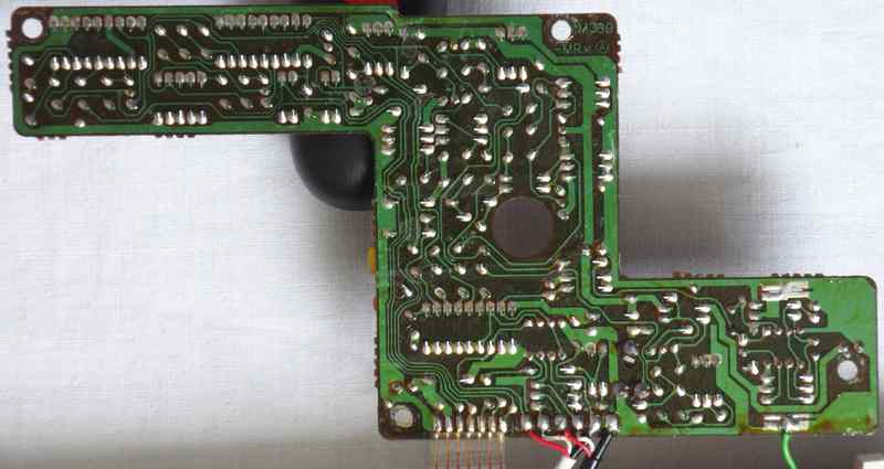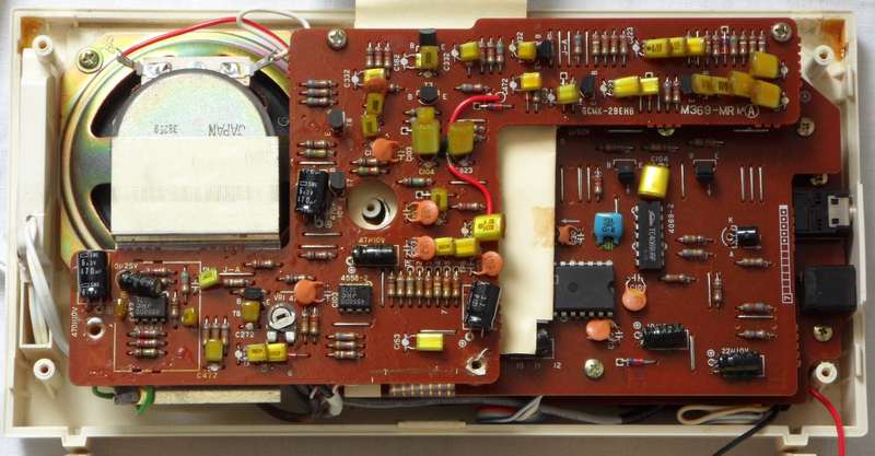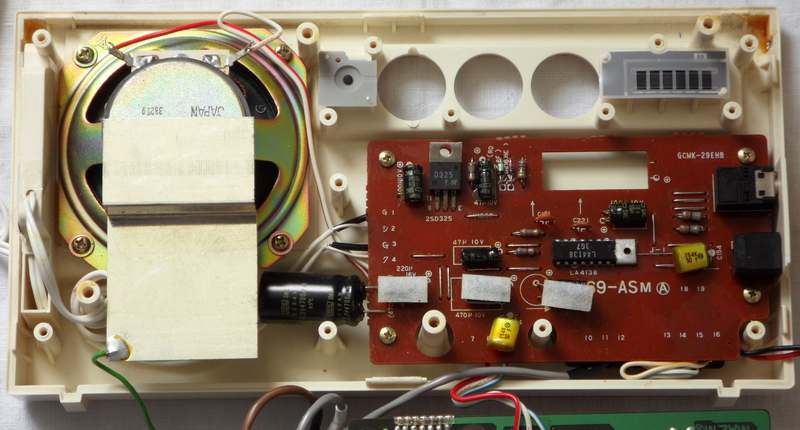 A lot of wild random crash sounds can be generated in my MT-40 by adding a shitshot button from pin 3 of the D8048C (for safety through a 1 kOhm resistor) against GND, which likely works also with the PT-7. keyboard unitBeside some other unused pins (anyway GND) wired to GND and the LC oscillator, the HD44140 is not wired that much differently than in Casio MT-45. A little strange is that the key matrix diodes were substituted with small SMD transistors (each used instead of 2 diodes) those have different types (pinouts) to minimize the use of bridges (the unmarked white resistors).caution: The sensor keyboard case is held closed by 3 tiny screws and 4 plastic tabs; to open it it is important to pull the plastic cover backwards (in the direction of the cable hole); do not bend it upward because this would crack off the plastic tabs. Be generally extremely careful with dismantling this delicate component. When open, the PCB hangs only on 2 strips of adhesive film and the foil cable. Danger!: The conductive glue under the foil cable is extremely brittle and will break by any small sideways motion or rotation of the PCB! My cable fell off without warning when I only tried to turn the ferrite core of the tuning coil (after 2 hours of successful measurement). It is impossible to remelt this glue by heat!