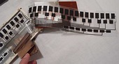 At the left side of the package is an unused short pin stub that is internally connected with +Vs (positive supply voltage) and apparently not counted as a pin. At the opposite side is no pin at all. The "NC" pins are unconnected, behave like inputs (high resistance) and have lo level. Pulling these to +Vs through 1K resistor seems to do nothing. It is unknown if some of the many pins wired to GND or +Vs are genuinely inputs or test pins. I see no complex signals for communication with a host CPU; likely the HD44140 is too dumb for this or interesting pins are just grounded. When shitshot (touching clock pins) it does nothing spectacular (sometimes stuck notes or silence or plain notes decaying naturally, but no new timbres), which hints that is a rather banal LSI circuit of hardwired logic gates and counters (even simpler than D77xG) with next to no software inside. Also the strange keyboard matrix layout (16 x 3) was likely done to simplify internal wiring. The PT-7 powers on with 'harp' preset sound, but MT-21 (slide switch in intermediate position) defaults to 'piano', thus I guess that in PT-7 external components (a capacitor?) set it to 'harp'. An obviously related real sound IC by Casio (controlled by a CPU, with