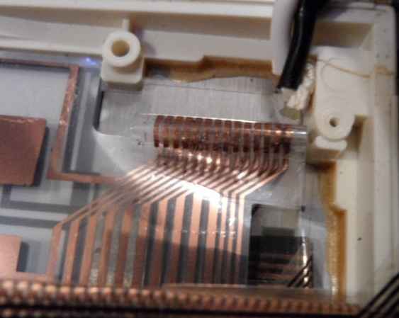 caution: Never play with sharp, spiky or rough objects (like finger nails) on the sensor keyboard surface - the foil may get damaged easily. At both keyboard sides the grooves for the 2 small metal hooks were filled with a smeary, tar-like substance, that sticks to the hooks and left black dirt stains everywhere. I suspect it was decomposed residues of wrongly mixed black rubber. (I found similar goo in Yamaha MP-1.) I used tissues, cotton swabs, a cable tie and a bit of isopropanol (do not soak the foil) to poke out and clean up most of it.