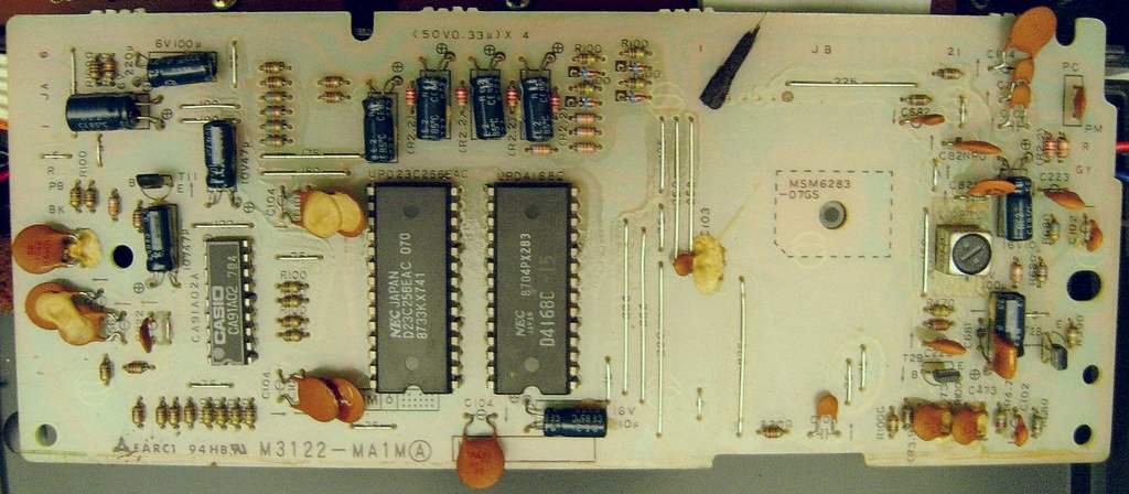 circuit bending detailsThe Casio SK-10 has multi-chip hardware based on the CPU "OKI M6283-07" with additional 32 KB ROM "NEC D23C256EAC 070" (I dumped it) and 8KB DRAM "NEC D4168C -15". The VCA IC "CA91A02" merges each waveform output with the corresponding envelope signal.