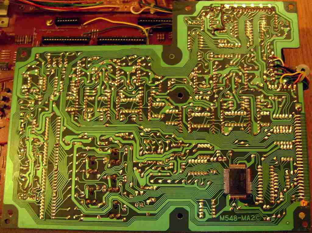The main CPU controls the D930G 11 apparently by simulating keyboard matrix inputs (which hints that there is no secret internal protocol). For this the CPU does not read its matrix outputs (KC1..KC10 are not used) but syncs with it and sends signals to the KI pins. Strange is that D930G pin 31 is wired hi through an 1k resistor, which may inform it about the absent sound IC or even change the data format for being controlled by an external CPU. (Casio Symphonytron RC-1 with similar configuration does this too.) This looks like a model select feature, and the 1k resistor hints that pin 31 can also act as output. The CPU data bus is latched through flipflops clocked by address line A3 during I/O access. (Logic gates are wired to CPU pins A3, IO /M and /WR to implement function "OR(NAND(A3,PC5),/WR)" The same logic is used in many places to select things by other address lines.) PA7 (RES) -> I1 (SCH)