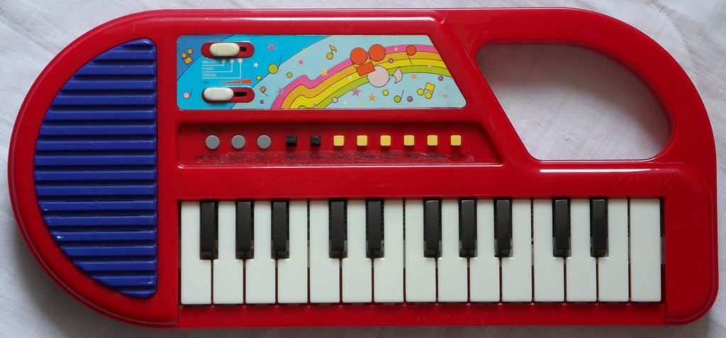 This red toy keyboard from 1990 (embossed case date) has a handle and blue, semicircular speaker, but there is no name on it. It plays 8 fantastic, grainy POKEY-style rhythms. Main voice is plain squarewave, but well playable.