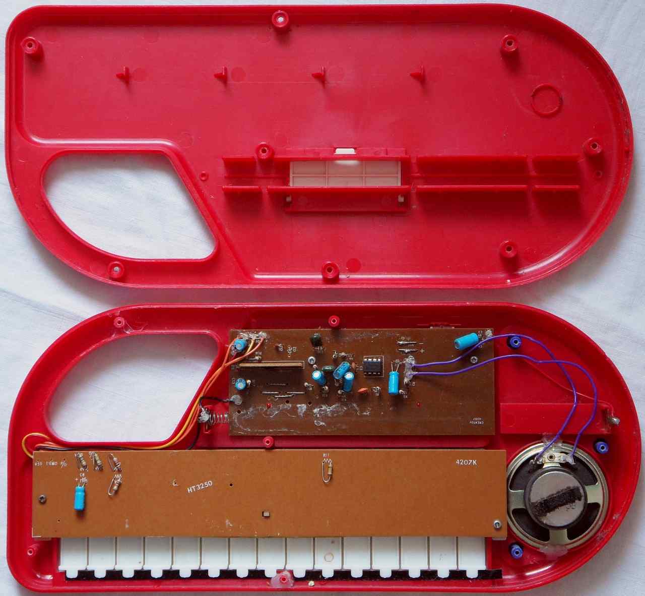 hardware detailsThe Creatoy 4207 keyboard is build around the main voice CPU HT3250 (unlabelled 40 pin COB) and rhythm CPU "3080" (15 pin COB, HT3080), those do not communicate with each other. Downloaded datasheets reveal that both were made by Holtek.