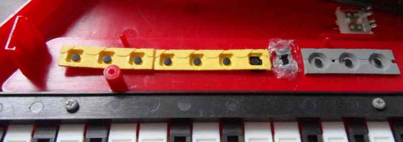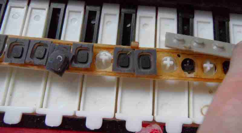 When I found the instrument on a flea market, 2 rhythm buttons of silicone were torn off and some silicone contacts of the keyboard didn't conduct anymore. Though I bought for about 2 EUR a "pocket databank" calculator with many silicone rubber keys to transplant the contacts from its mat to the defective keyboard. =>It is now playable again.