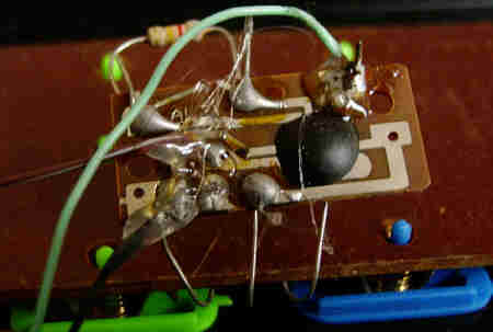 hand- bent and soldered very crude tin leaf switches and resistors underneath).