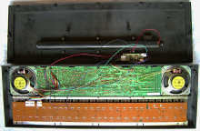 The chord voice of manual chord and accompaniment is made from plain squarewave with a small dose of sustain. The full polyphonic accompaniment is of the same ancient type like with Antonelli Star 2379. It chops the chord voice simply into a staccato and there is an additional warm and dull analogue e-bass voice that toggles between the note of the lowest and highest held chord section key. The accompaniment responds fast enough to trill chord notes, but unfortunately chord memory can not be turned off, thus chord notes stay always held after key release, which prevents clever play tricks. With rhythm off there is a manual chord mode.