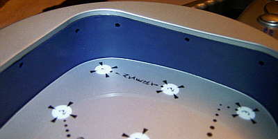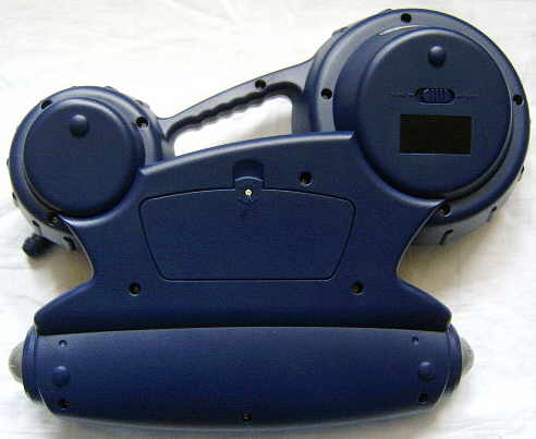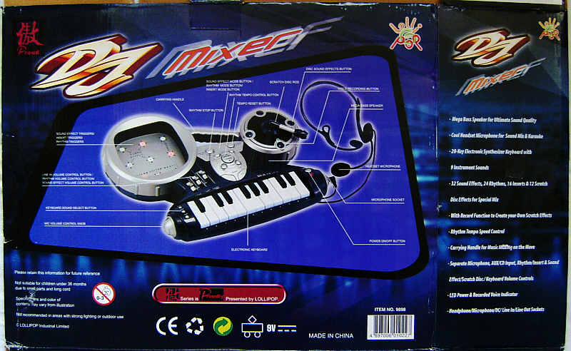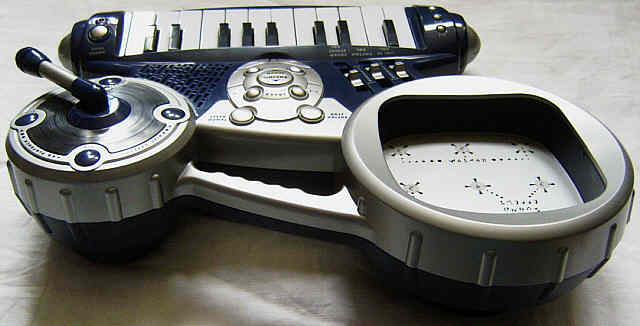 What's that? - is this an extraterrestrial lawnmower with built-in kitchen sink? No, it is a toy groovebox keyboard made in 2004 (printed PCB date) by Lollipop Industrial Limited, with plenty of sound effect samples and lo-fi background preset music pattern loops. Instead of drumpad buttons it employs optical touch sensors and can even store a 5 seconds short lo-fi sample.