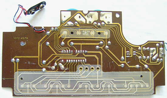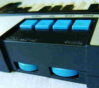 The preset rhythm buttons switch the rhythm after 1 step (i.e. almost immediately) and there are various strange glitches those permit fill-in- like live play tricks. So long any single preset rhythm button is held, the instrument plays the low conga in a loop. Holding 'disco' + 'pop' plays the hihat in a loop while holding any other 2 preset rhythm buttons mutes the rhythm (plays silence in a loop). Interesting with the POKEY hihat loop is that you can well hear how the shift register waveform changes its timbre every beat. Rhythms are started with either their OBS buttons or with the tempo button. But the tempo button apparently only sets the tempo to zero when it stops a rhythm, because the next press on the tempo button does not start the pattern from beginning but from where it stopped, and after power on it starts no rhythm at all because none was selected yet. Pressing any button (while none is held) apparently restarts the internal rhythm tempo oscillator when it was previously halted with the tempo button. Thus when you stop the rhythm with the tempo button while any rhythm buttons are still held, you can not restart the rhythm until you first release all buttons.