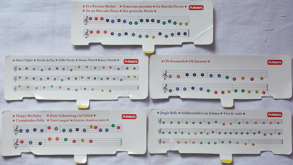 The 12 demo melodies are simple monophonic monotos (short melody loops) those employ the currently selected main voice sound but each of them has its own rhythm. Their primitive repeating sound style and song set resembles the melody IC of transistor tooters like Golden Camel-7A , so it may be that both chips were designed by the same people.