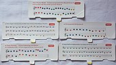 Nick Santos sent me an e-mail with the following hardware tips about the Playskool PS-635, which apparently refers to the 40 pin version: "Although I am still in the experimentation and documentation stage of this bend I have found some promising bends. As you may have noticed, pins 10-26 seem to deal with they keys and buttons of this device. I saw that pins 10 and 12 were being used but pin 11 was conspicuously unused, I used some wire and probes and proceeded to connect pin 11 to the other key control pins with pleasing results pin 11 connected to pin 15, 16 17 or 18 will produce the kick, cowbell, loud snare and soft snare respectively. When pin 11 is connected to pins 21-26 it will produce lower pitch notes that were not included in the design. You mentioned that you would like to use the pre programmed rhythms and cancel out the main instrument voice, I have discovered how to do this as well. Connect the pin nearest the headphone jack of the capacitor nearest the headphone jack, to pin 1 of the instruments main chip, this will completely cut out the main voice and leave the rhythm (if you attach to the wrong pole of the capacitor a very faint main voice will remain) to do the opposite and strip away the rhythm from the songs connect the same pin of the capacitor to pins 5 or 6 of the main chip (it will also boost the volume).Traktor told by e-mail that there are plenty of additional hidden rhythm pattern variants. multipulse squarewave tone generatorWhile the technology is the same like in EK-001 (see there), interesting is that many multipulses differ. (I tried inverting and rotating, but they won't match.) So the 'piano' waveform is more complex, and the 'guitar' is less harsh and closer to an acoustic one. Some multipulses have a strange dot (short dropout to lo) in their hi section. I expect this artifact to be caused by restarting the address counter at the begin of the loop point. Thus I have visually rotated these patterns to shift the dot (marked ".") to their end. (Other multipulses likely have it at a lo section, where it stays invisible.) Because the patterns are complex, the exact section lengths are hard to see on an analogue oscilloscope. Particularly with 'piano' I am not sure, but it definitely differs from EK-001. The 'horn' is still a 3:5 squarewave, only inverted and here rotated to move the dot to the end. The 'banjo' also here has mandolin ring.What I identified as 'guitar' corresponds to 'piano' in MS-210B (see there) so it may be considered piano by the manufacturer. But IMO it sounds much more like an acoustic guitar than like the piano of EK-001 or an actual piano. The multipulse bit loops look like this: