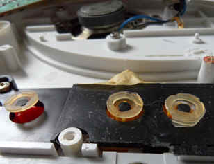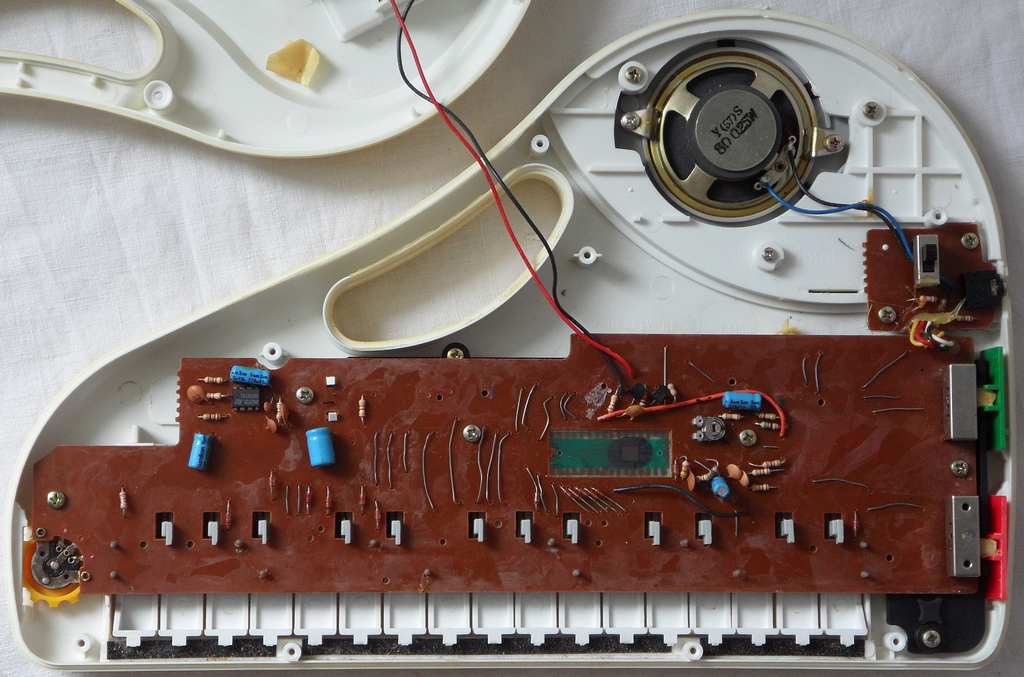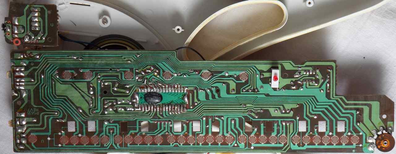 circuit bending detailsThe Playskool PS-635 is build around a single chip CPU. Mine (PCB revision "PS635, REV7") has a 32 pin DIL-shaped COB "635-21", but older versions have the same chip in a 40 pin DIL package "PWH635" with additional unused pins, those are even more interesting for modification. Thus if you want to buy one for upgrades, check the model plate at the case bottom. Mine has "SERVICE NO. P-635-B-B-(7)" and only 32 pins. Traktor ("T-150") told me that his 40 pin version was labelled "P-635-B-A-(7)".