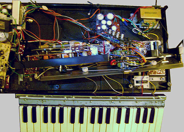 On the keyboard PCB is a trimmer to tune the main voice; a small PCB connected