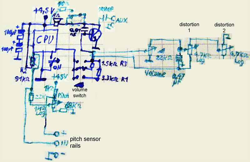 circuit bending detailsThe SoundWaves MG-1530 is based on a single chip CPU (unmarked COB, PCB label "MG1530A-3") with resemblance to My Music Center.I later identified this CPU by a datasheet of 1997-12-04 as Holtek HT3630A "Funny Guitar", which is an application of the "2 Channels Ad-lib Micro®" microcontroller HT3630. It has 2K*14 bit ROM, 96 byte RAM, 2 channel static waveform "ETS" synth with 8 waveforms (7 bit, 64 steps, ADSR) and 4 channel blip percussion generator. These percussions {base, hihat, cowbell, snare} are implemented in hardware and have no software parameters. (They are triggered by setting each their bit in a register; 'cymbal' has to additionally set the 'hihat' bit.) When I bought this instrument, an idiot had pushed in the LED caps (solder joints torn off) and crushed the silicone contacts under all round buttons; because the shafts under the buttons are hollow cylinders with slightly sharp rims, they hat punched out the center contact of the silicone rubber switches like a cookie by a cookie mould. Thus I had to dig the pieces out of the cylinders, fill the cylinders with hotglue and glue the pieces back into place =>buttons work again. pitchbend, volume control & distortionLike in My Music Center, the resistor controlled clock oscillator can be easily modified with potentiometers and touch sensor contacts for pitchbend. When clocked down, also here the pulses of the time slice DAC transform into strange tekkno bleep patterns. 3 additional pots at the single transistor amplifier control analogue volume and distortion. |