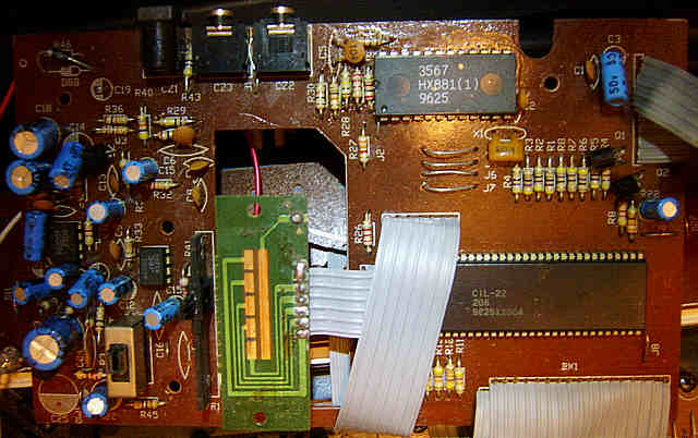 cables of EK- keyboards and the darker PCBs with flimsy grey ribbon cables