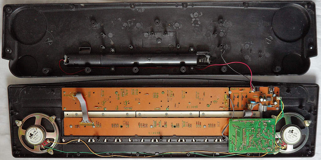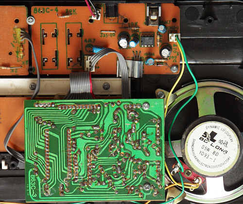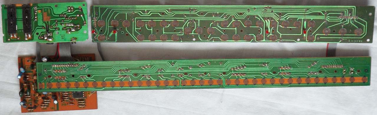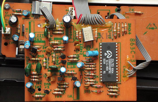 The small PCB contains quite much analogue stuff, similar like my MC-2 instruments although the CPU has less pins. The green writing on the beige PCB top looks like copied from something hand written, thus it was likely designed without computer. On the keys and panel PCB back is the small number "93.1.8", which may be the manufacturing date.