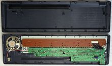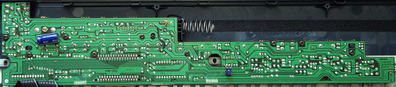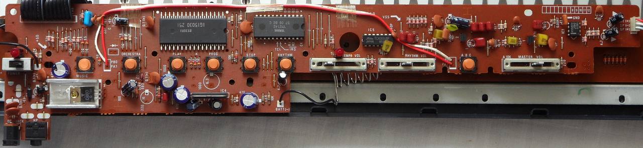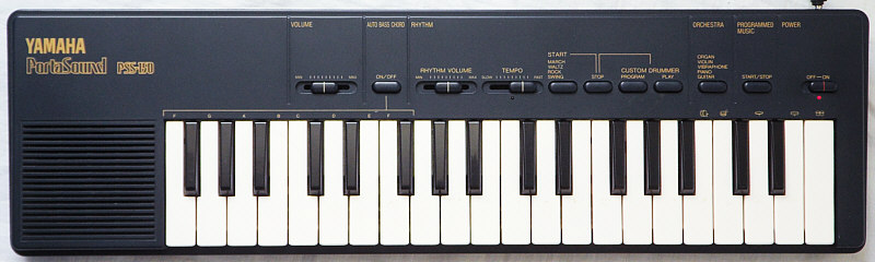 This simple Yamaha PortaSound beginners keyboard from 1985(?) has only 4 rhythms and 5 sounds, but features an interesting programmable drum pattern ("custom drummer"). The instrument has 4 note polyphonic squarewave sounds and a few interesting electronic percussion.