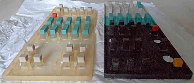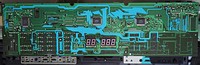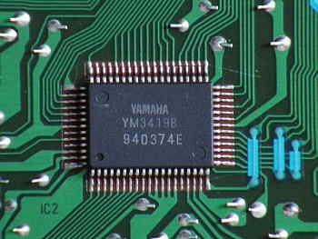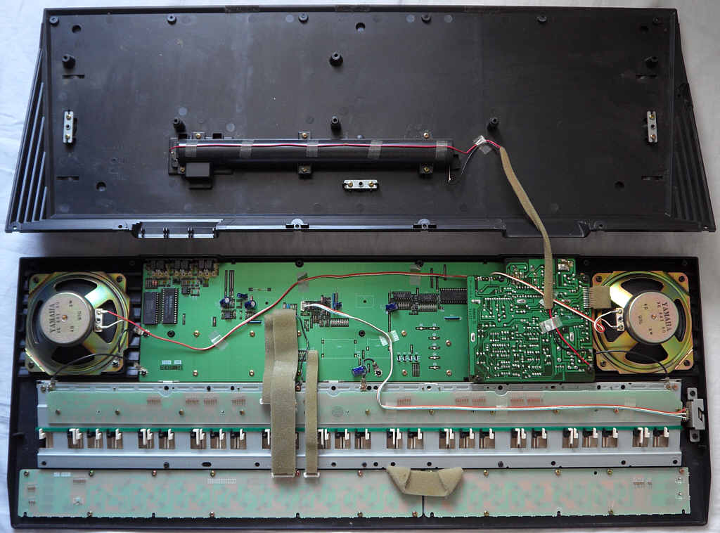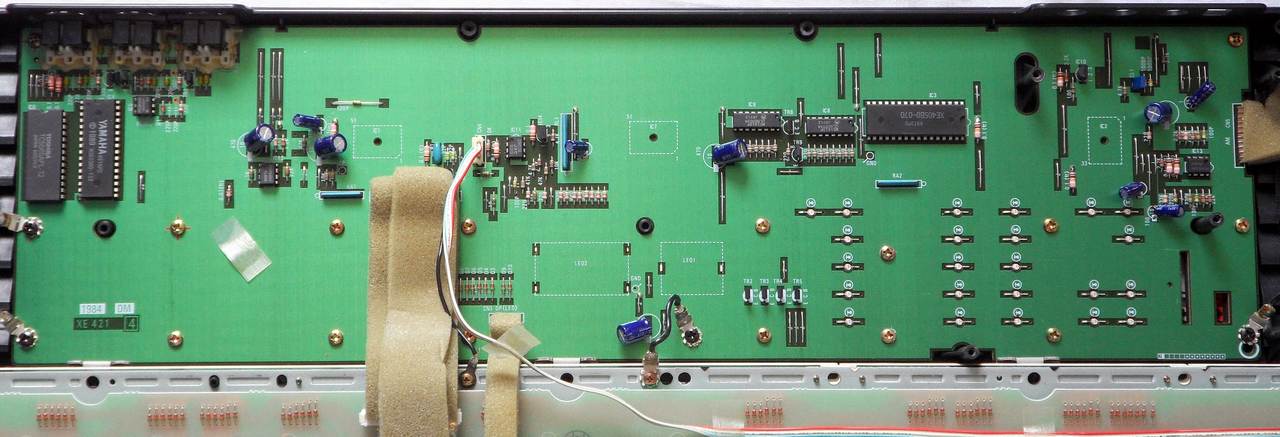 Most parameter are changed by pressing a corresponding select button and then change the value with 2 small black "value" +/- rubber buttons, those are badly visible. (These buttons can not be used to quickly step through the 100 voice bank, which is annoying.) Due to these buttons also edit FM parameters and the main voice volume, it would be interesting to solder in a digital rotary endless controller (a knob with a mouse- like optical encoder and a few 74LS ICs for direction sensing) for this function, because this way also any of the FM parameters would become controllable in realtime during performance. (The +/- buttons react well on rapid single presses, and only switch into fast counting mode when held down longer. Pressing both +/- buttons resets the parameter to default.)